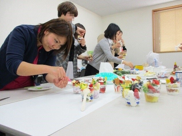 忘年会ということで、学習企画の他にお楽しみ企画もしよう!と、今回はトライフル作りもしました。スポンジケーキ、生クリーム、フルーツ、チョコ等様々な具材を使って、自分の好きなように作り上げていくスイーツです。個性出てますよね?